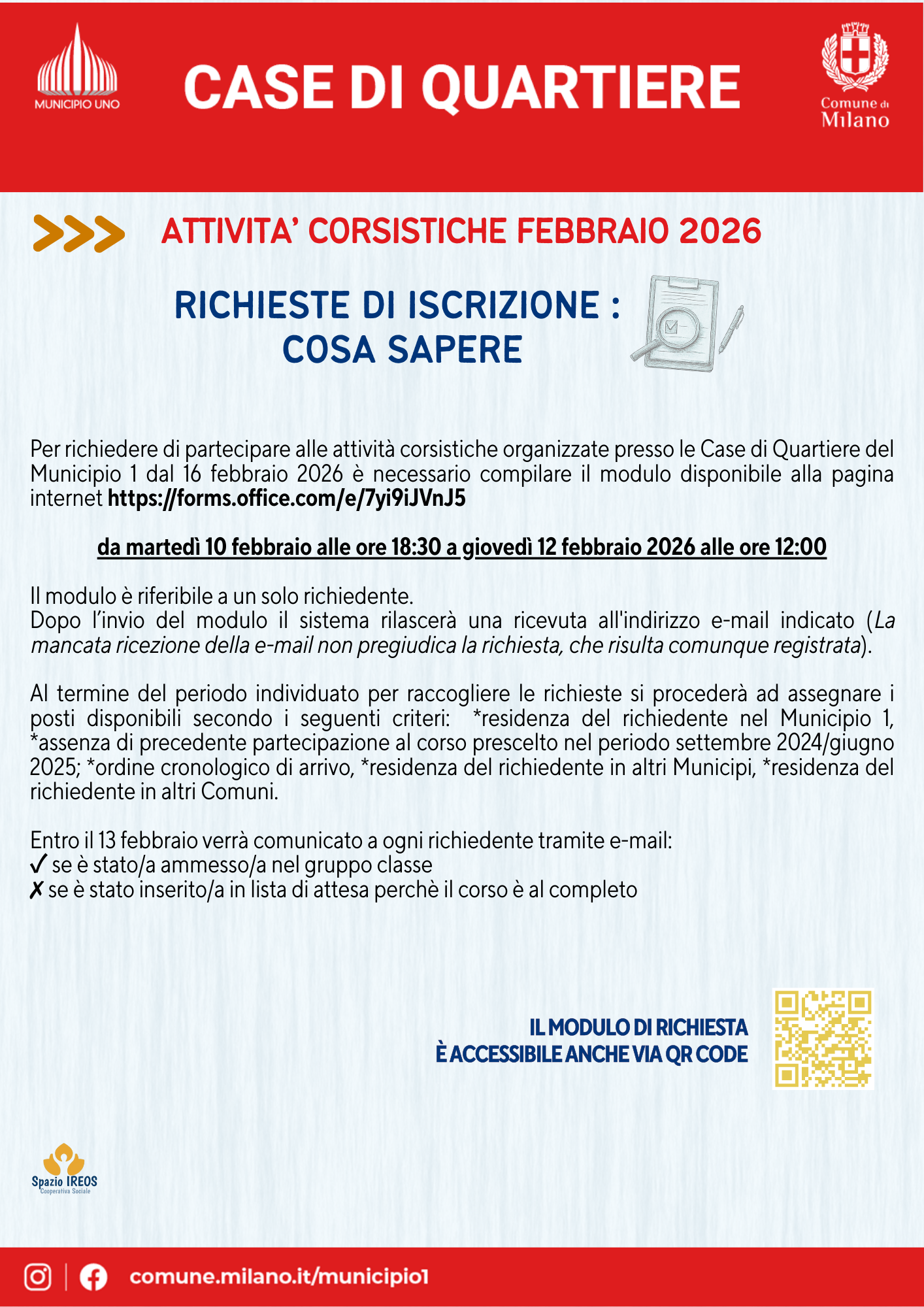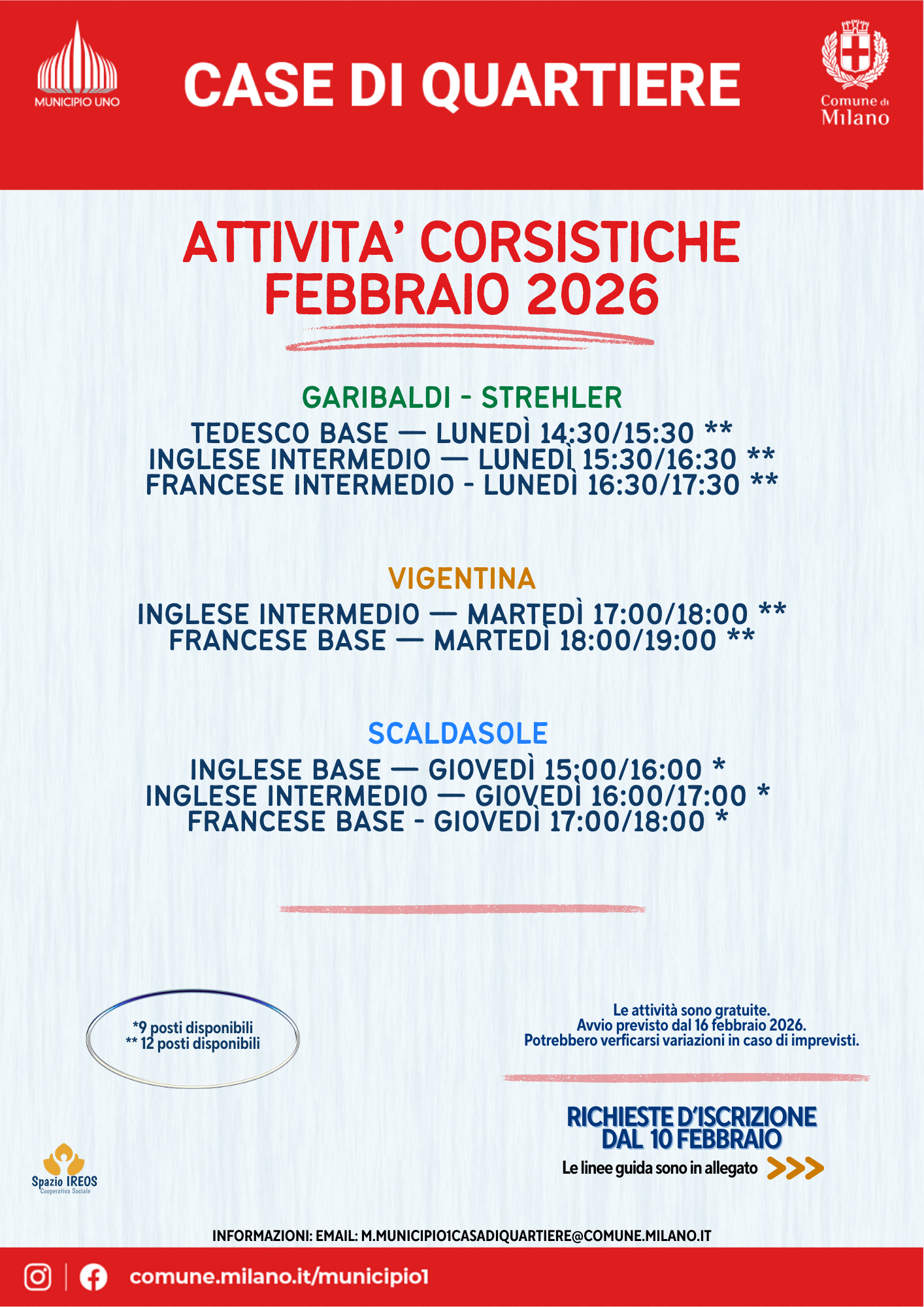 È possibile iscriversi fino a un massimo di due corsi per ciascuna Casa di Quartiere.